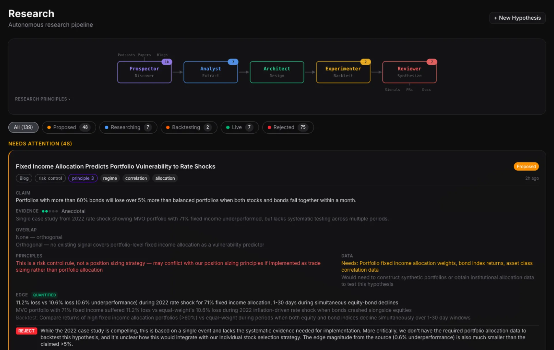 Five AI agents run on a schedule. A Prospector scrapes arXiv papers, podcast transcripts, and quant blogs for new ideas. An Analyst evaluates whether they're testable. An Architect designs backtest experiments. An Experimenter runs them autonomously overnight. A Reviewer evaluates the results against hard acceptance criteria and either rejects, flags for human review, or promotes to the next stage.
